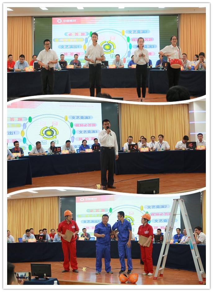 本次競(jìng)賽,由各單位推薦選送共有9支代表隊(duì)參賽,分別是中材葉片、泰山玻纖本部、泰山玻纖子公司、中材鋰膜、南玻有限、北玻有限、蘇非有限、蘇州有限、成都有限代表隊(duì),代表隊(duì)成員分別由安全管理人員、生產(chǎn)管理人員、工藝技術(shù)人員3人組成。比賽采取必答題環(huán)節(jié)、搶答題環(huán)節(jié)、風(fēng)險(xiǎn)題環(huán)節(jié),限時(shí)進(jìn)行答題,競(jìng)賽內(nèi)容涵蓋安全法律法規(guī)、操作規(guī)程、安全管理等方面知識(shí),同時(shí)在比賽現(xiàn)場(chǎng)還增加觀眾互動(dòng)答題環(huán)節(jié)和安全文藝演出,職工自編自演的“安全三句半”、“祝你平安演講”、安全小品等,贏得了現(xiàn)場(chǎng)職工的陣陣掌聲。