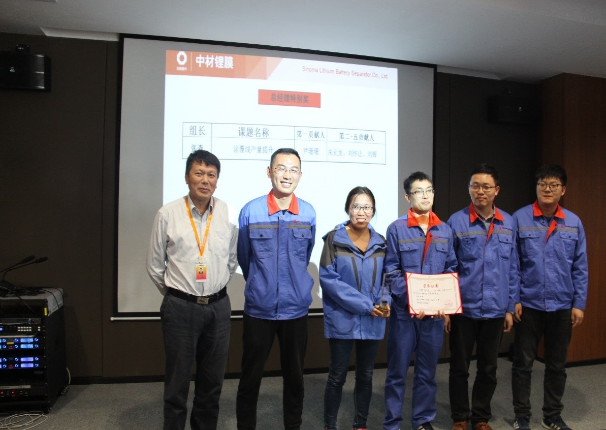 - 為提升企業質量管理體系、激勵職工創新積極性、增強企業競爭力、促進企業的和諧發展,本年度中材鋰膜更加注重QC課題工作的開展。10月23日,公司品質保證部舉行2018年前三季度QC課題頒獎儀式。前三季度共收到QC課題88個,經過綜合評定出:總經理特別獎1名、一等獎3名、二等獎7名、三等獎15名、知識貢獻獎62名。總經理宋尚軍、副總經理白耀宗以及各部門負責人分別為獲獎同事頒獎。