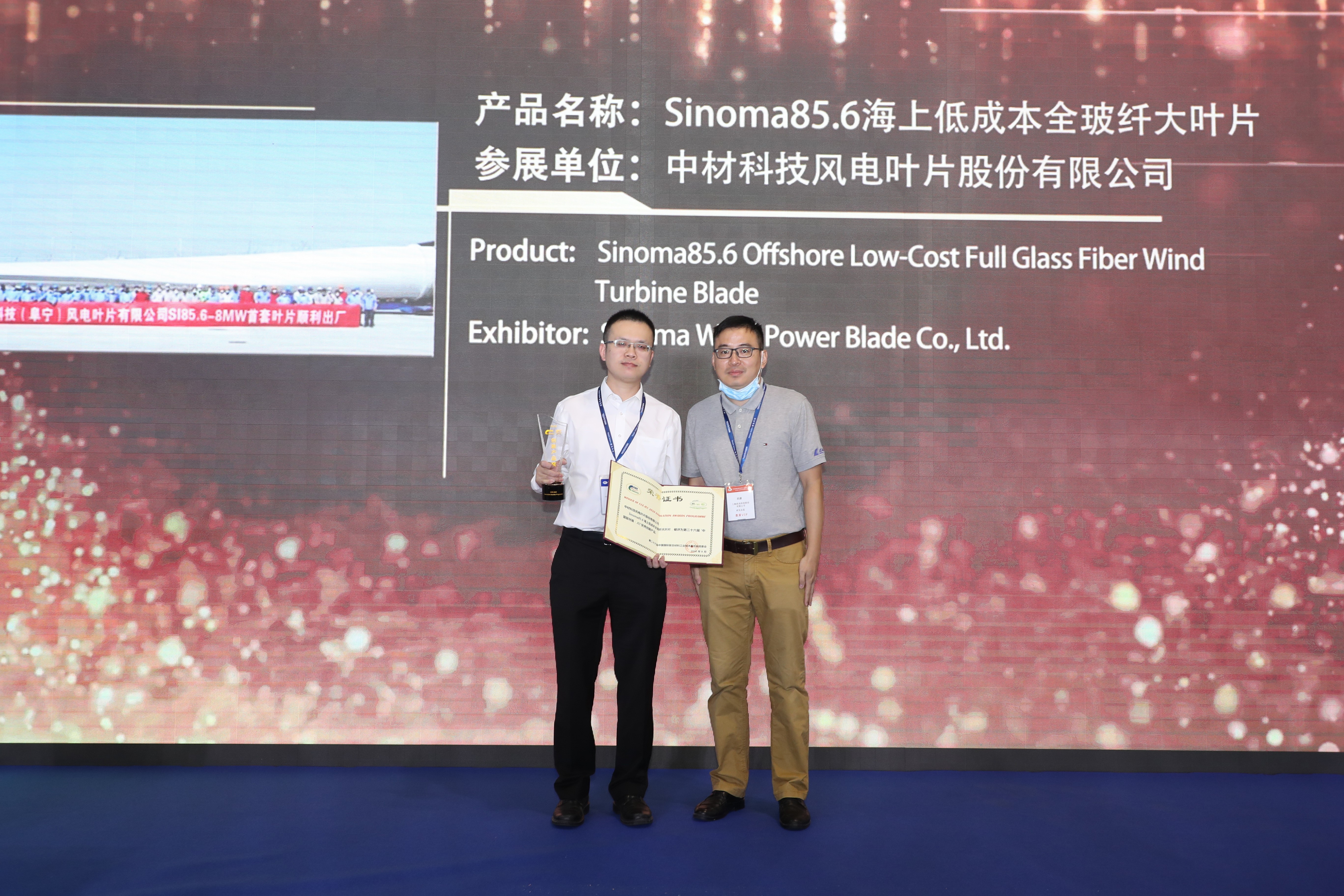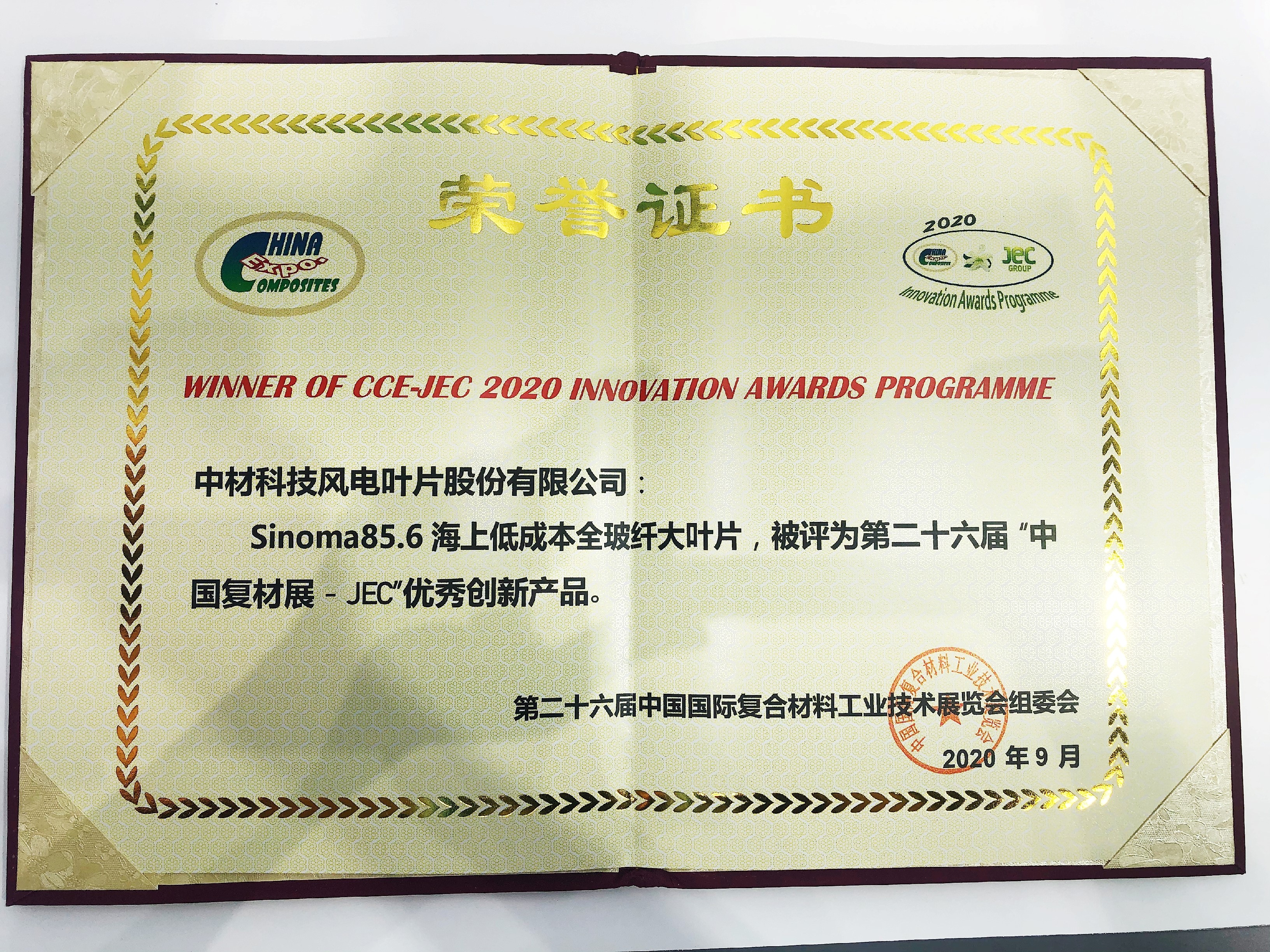 9月2日上午11點(diǎn),在世博館2號(hào)館的新聞發(fā)布區(qū)舉行了隆重的2020 CCE-JEC創(chuàng)新產(chǎn)品頒獎(jiǎng)儀式,來(lái)自國(guó)內(nèi)外34家企業(yè)的44件創(chuàng)新產(chǎn)品角逐原材料、應(yīng)用、工藝技術(shù)及設(shè)備三大類9項(xiàng)大獎(jiǎng)。中材科技風(fēng)電葉片股份有限公司的參展產(chǎn)品“Sinoma85.6海上低成本全玻纖大葉片”被評(píng)為第二十六屆“中國(guó)復(fù)材展-JEC”優(yōu)秀創(chuàng)新產(chǎn)品獎(jiǎng)。公司董事長(zhǎng)薛忠民參加了頒獎(jiǎng)儀式。